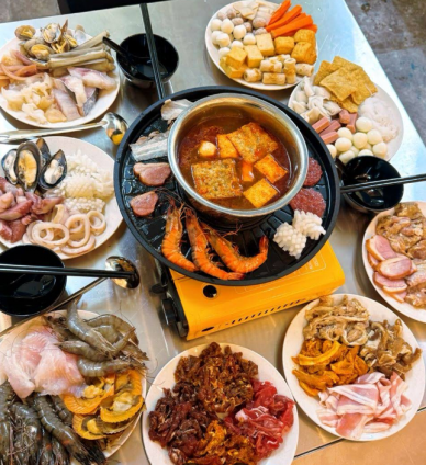 Thai Mookata Steamboat Ipoh offers smoky grill and steamboat combo meals. Guests cook marinated meats and seafood right at their tables. The soup bases include tom yum and chicken herb options.